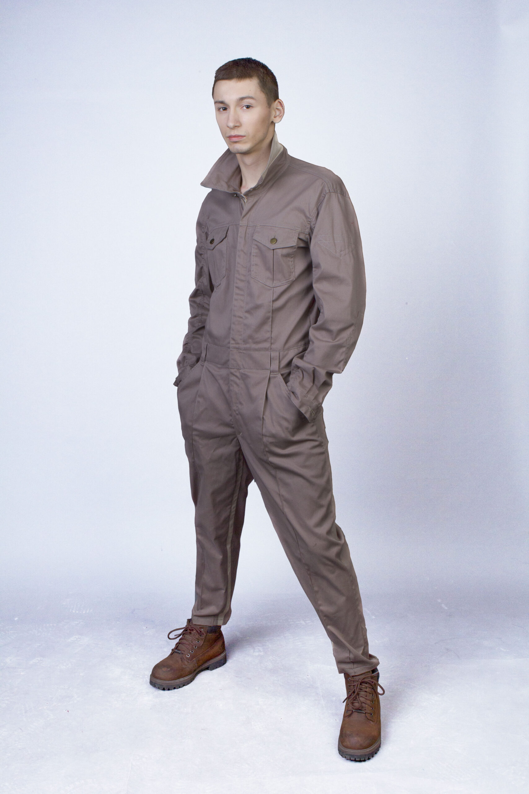 Комбинезон изготовлен из хлопка с эластаном, на груди два накладных кармана с клапанами на пуговицах, застежка – молния, спинка с кокеткой и внутренней складой для комфорта, на задних половинках брюк накладные карманы с клапанами на пуговицах, рукава с манжетами на пуговицах.