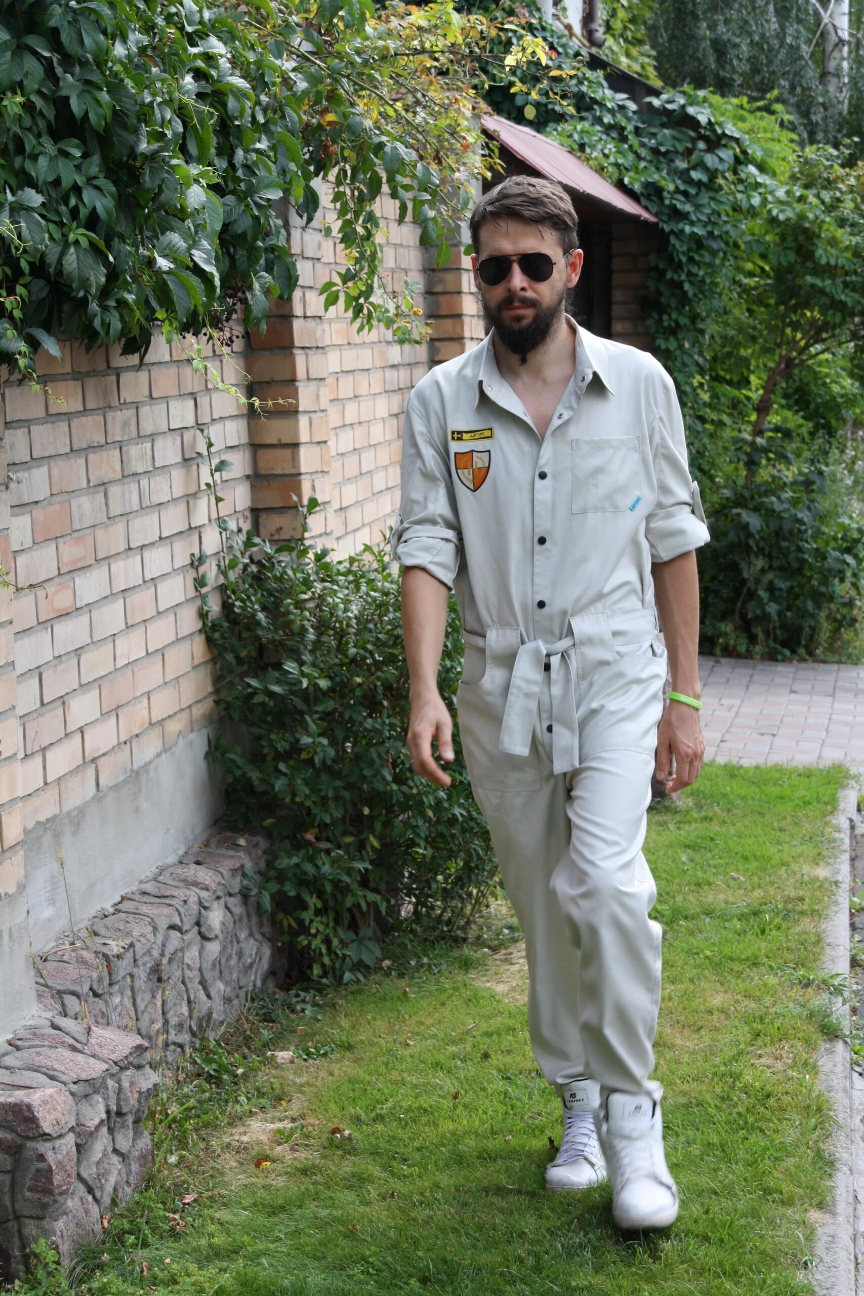 Комбинезон изготовлен из льна, с добавлением полиєстера; с рубашечным воротником, на кнопках, с поясом. Имеет нагрудный накладной карман, спинка с кокеткой. На передних и на задних половинках брюк накладные карманы. Рукава с манжетами на пуговицах, имеют хлястики с кнопками для фиксации подкатывания рукавов. Комбинезон отделан фирменными шевронами и кнопкками.