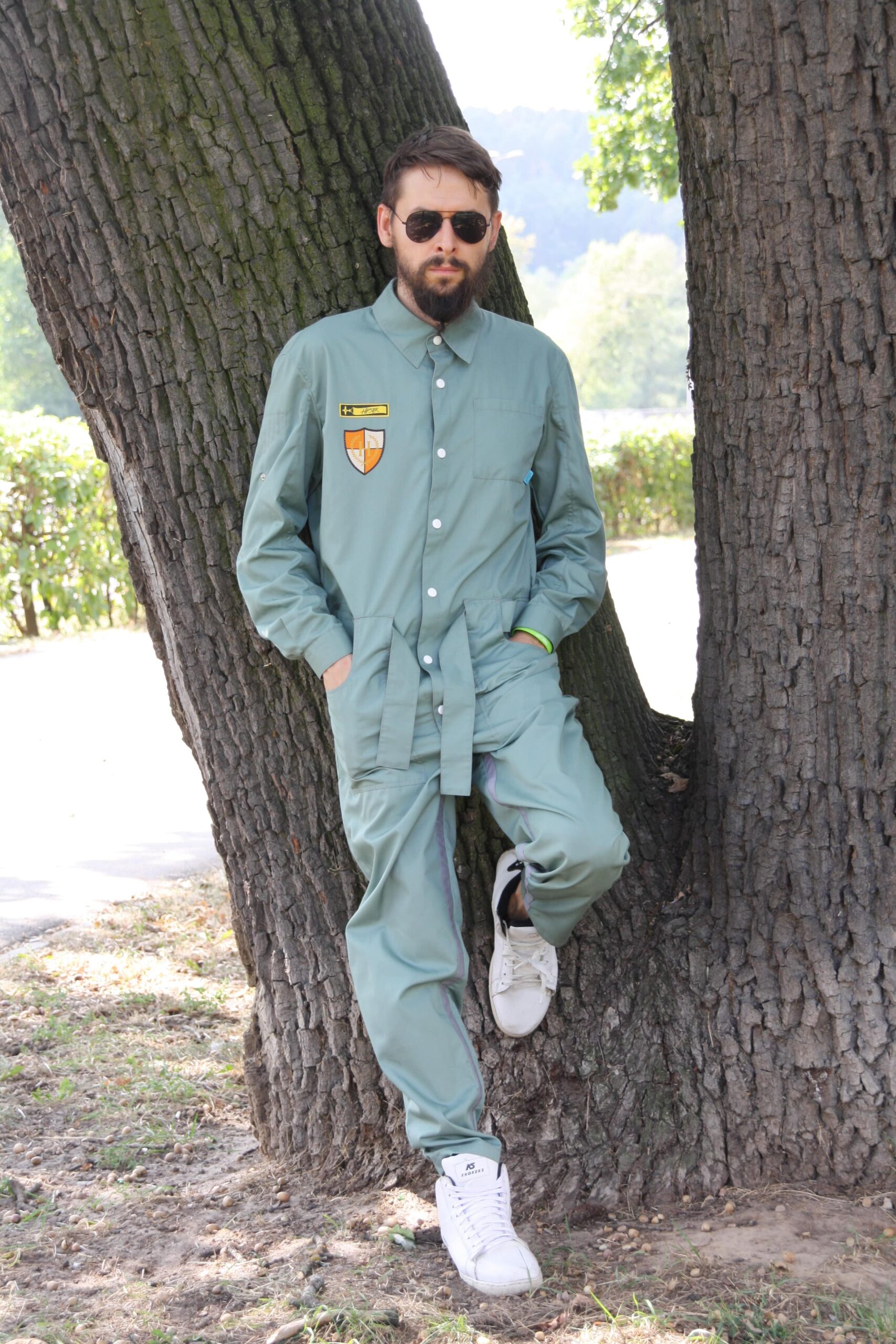 Комбинезон изготовлен из хлопка, с добавлением полиэстера; с рубашечным воротником, на кнопках, с поясом. Имеет нагрудный накладной карман, спинка с кокеткой. На передних и на задних половинках брюк накладные карманы. Рукава с манжетами на пуговицах, имеют хлястики с кнопками для фиксации подкатывания рукавов. Комбинезон отделан фирменными шевронами и кнопкками.
