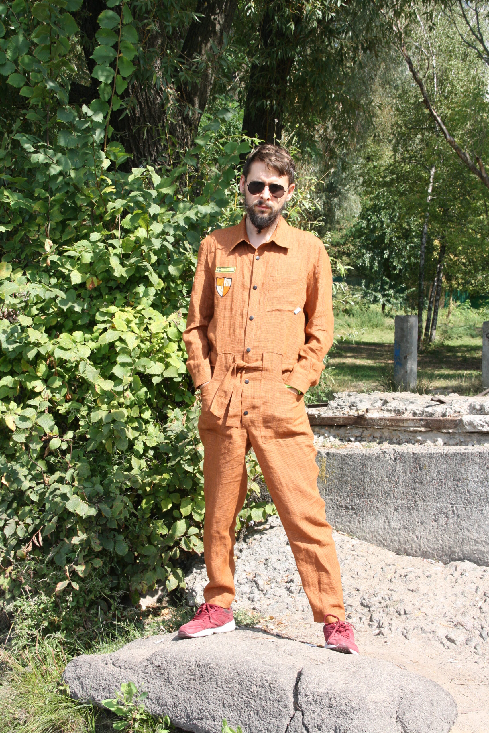 Комбинезон изготовлен из льна; с рубашечным воротником, на кнопках, с поясом. Имеет нагрудный накладной карман, спинка с кокеткой. На передних и на задних половинках брюк накладные карманы. Рукава с манжетами на пуговицах, имеют хлястики с кнопками для фиксации подкатывания рукавов. Комбинезон отделан фирменными шевронами и кнопкками.