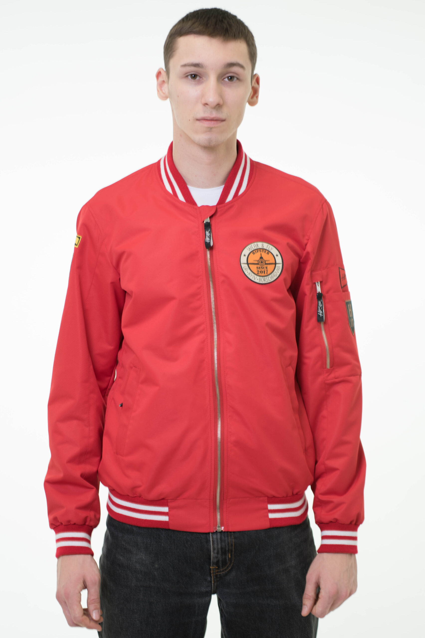 Куртка “Бомбер” изготовлена из плащевой ткани, которая отличается высокой плотностью, водоотталкивающими свойствами, но при этом легкая и приятная на ощупь. Рукава, горловина и низ куртки отделаны трикотажными довязами, гармонирующими с цветом куртки. На левом рукаве сервисный карман на молнии. Куртка дополнена брендированными шевронами, имеет два боковых кармана и два внутренних кармана на молниях. Наш вдохновляющий message для любителей бомберов – “LIFE NEEDS NO WINGS TO FLY ; WEAR & FLY ” будет всегда с Вами, так как напечатан с внутренней стороны на подкладке куртки!