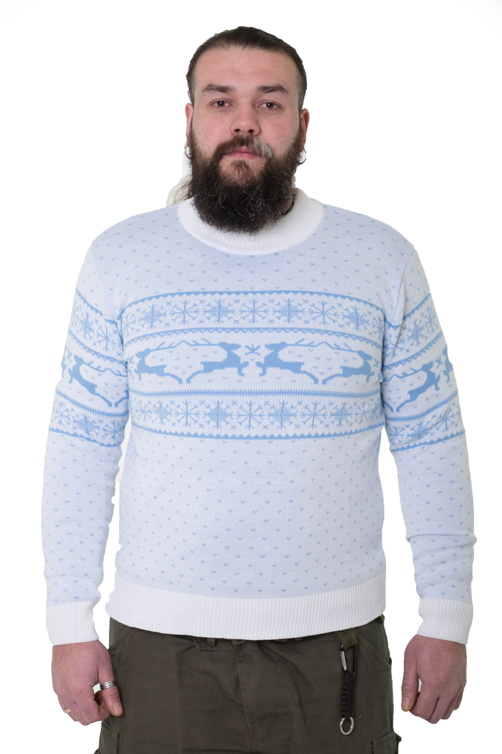 Свитер с традиционным зимним орнаментом с оленями, выполненный в ярких цветах из пряжи стабилизированного акрила жаккардовым переплетением, благодаря чему свитер сохраняет свою форму и размеры в носке и после стирки.