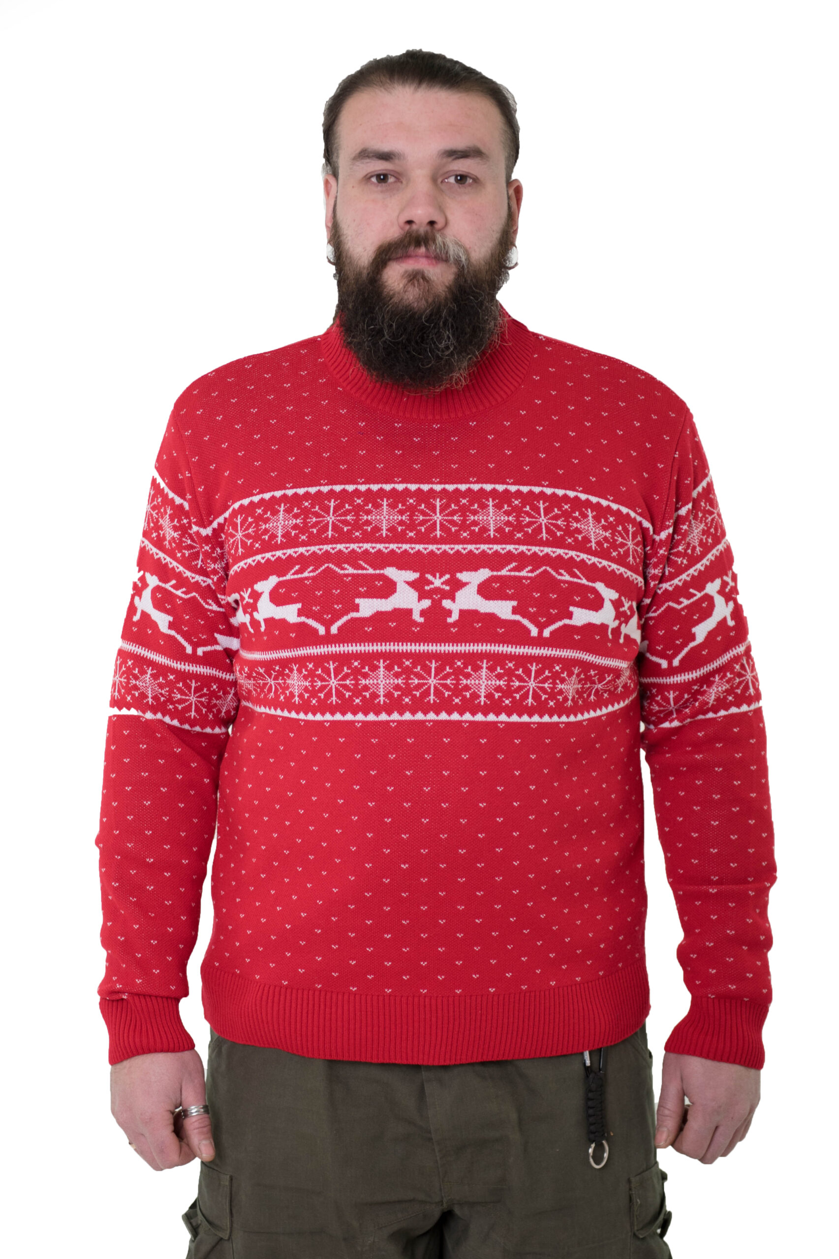 Свитер с традиционным зимним орнаментом с оленями, выполненный в ярких цветах из пряжи стабилизированного акрила жаккардовым переплетением, благодаря чему свитер сохраняет свою форму и размеры в носке и после стирки.